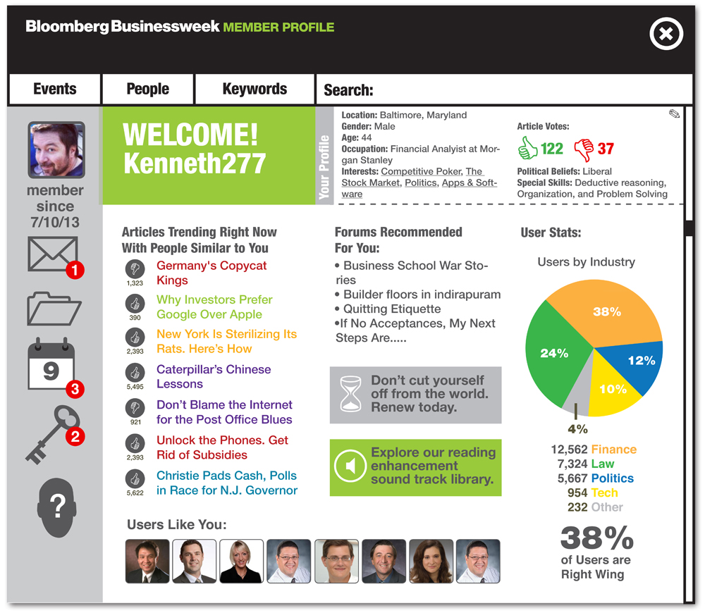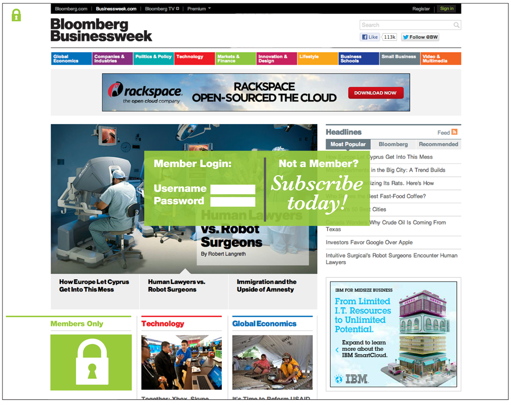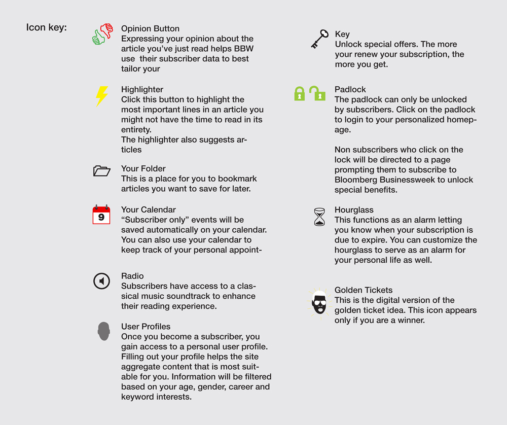 This microsite is designed exclusively for BBW subscribers as a way to encourage readers to continue subscribing to the magazine. Upon visiting BloombergBusinessweek.com, users are given the choice to sign up for a subscription in order to unlock special features on the site, including a