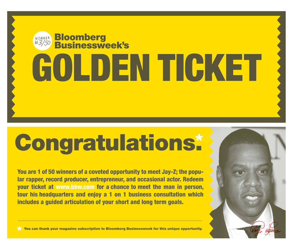 A handful of "golden tickets" are sprinkled inside a limited number of Bloomberg Businessweek copies. Whoever is lucky enough to find a ticket in their magazine wins a chance to meet Jay-Z or similar entrepreneurial celebrities.
